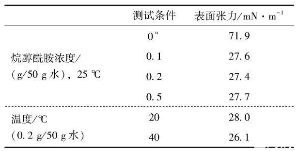 某學(xué)生自制烷醇酰胺不同測試下表面張力測試值,如表1所示。合成的烷醇酰胺具有較強(qiáng)的表面活性。25℃下純水表面張力為71.9℃mN/m。當(dāng)50 g水中加入0.1 g烷醇酰胺時(shí),其表面張力顯著降低,為27.6 mN/m。當(dāng)增至0.2 g時(shí)達(dá)到最低值(27.4 mN/m),繼續(xù)增加,反而略有增加。上述結(jié)果表明,0.2 g烷醇酰胺加入量已達(dá)到其CMC濃度。同樣,在最佳濃度下(0.2 g/50 g水),隨著測試溫度的升高,烷醇酰胺水溶液表面張力降低。