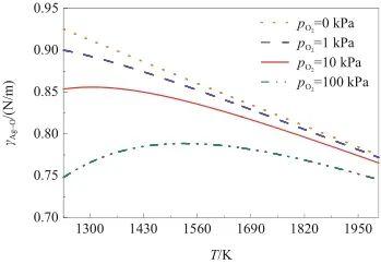 圖6研究了在不同氧氣壓力條件下,γAg-O隨溫度的變化關(guān)系。由圖可知,當(dāng)氧氣壓力低于10 kPa時,γAg-O與溫度呈負相關(guān)。而當(dāng)氧氣壓力高于10 kPa時,隨著溫度升高,γAg-O呈現(xiàn)先增大后減小的趨勢,并且隨著氧氣壓力增加,這種轉(zhuǎn)變幅度增大。這是因為γAg-O受溫度和氧溶解度的共同影響。一方面,隨著溫度升高,液態(tài)Ag的表面張力(γAg)降低,從而導(dǎo)致γAg-O降低;另一方面,液態(tài)Ag-O系中的氧溶解度與溫度呈負相關(guān),當(dāng)溫度升高時氧溶解度下降,導(dǎo)致表面氧吸附量減少,進而引起γAg-O增加。因此,當(dāng)溫度較低時,氧溶解度成為影響γAg-O的主要因素;而在較高的溫度條件下,溫度成為主要因素。
