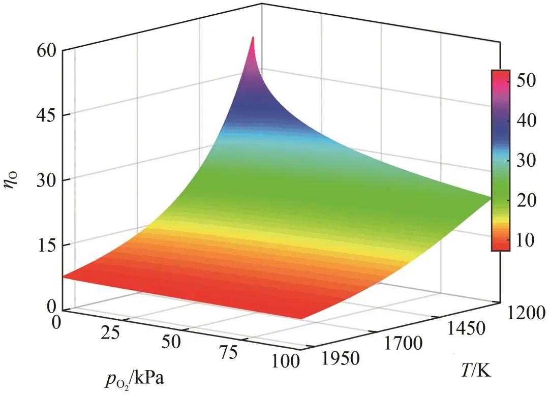 由圖7可知,當(dāng)溫度低于1500 K時,ΓO,Ag隨氧氣壓力升高顯著增加;當(dāng)溫度高于1500 K時,由于液態(tài)Ag-O系中的氧溶解度顯著降低,ΓO,Ag隨氧氣壓力的增加,其增加幅度減小。觀察圖8可知,η隨著溫度和氧分壓的升高而呈現(xiàn)下降趨勢。這是因為式(27)中的表面偏析平衡系數(shù)KII與溫度呈負相關(guān),當(dāng)溫度升高時KII減小,導(dǎo)致表面氧濃度降低。此外,在較低的氧分壓條件下,O原子傾向富集于表面;當(dāng)氧分壓升高時,更多的O原子溶入液態(tài)Ag-O系中,引起η減小。