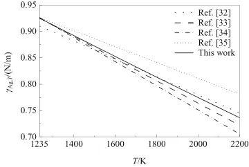 根據(jù)式(7),計算了液態(tài)Ag的表面張力γAg,T,結(jié)果如圖3所示??傮w上,隨著溫度的升高,γAg,T呈現(xiàn)近似線性下降的趨勢。從圖中可以看出,γAg,T的預(yù)測值與文獻[32-34]具有較好的一致性,但略低于文獻[35]。