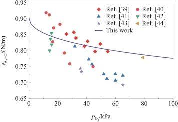 根據(jù)式(33),計算了1350 K下液態(tài)Ag-O系的表面張力γAg-O,并將計算結(jié)果與文獻數(shù)據(jù)[39-44]進行比較,如圖5所示。觀察圖5可知,γAg-O與氧氣壓力呈負相關(guān)。在較低的氧氣壓力下,γAg-O的下降幅度比較顯著;而隨著氧氣壓力增加,γAg-O的下降幅度逐漸減小。另外,計算結(jié)果與文獻[39,40,44]吻合良好,但高于文獻[41-43]。這種差異是可以接受的,因為所采用模型僅考慮了溫度和氧氣壓力,而在實驗過程中,系統(tǒng)的表面張力不可避免地受到雜質(zhì)的影響。