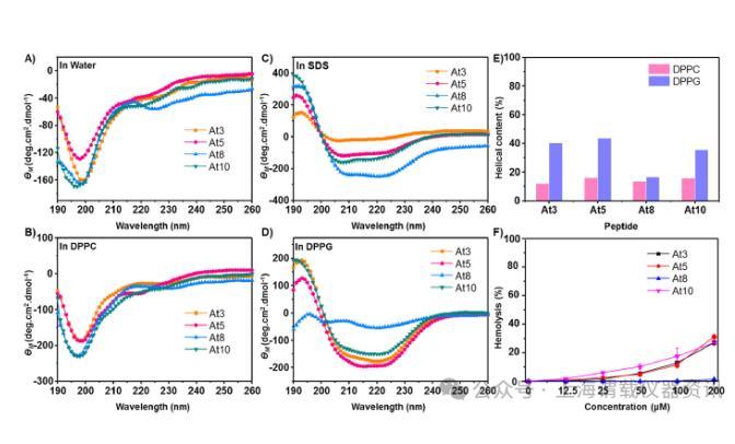 圖2、設(shè)計(jì)肽的二級結(jié)構(gòu)和溶血特性。(A)水、(B)25 mM SDS、(C)兩性離子DPPC SUV(0.25 mg mL-1)和(D)帶負(fù)電荷的DPPG SUV(0.25 mg mL-1)中肽的CD光譜。所有四種肽(At3、At5、At8、At10)在水和DPPC SUV中均呈現(xiàn)無規(guī)卷曲結(jié)構(gòu),而在SDS和DPPG SUV中均采用螺旋結(jié)構(gòu)。肽濃度固定在0.1 mM。所有測量均在室溫下進(jìn)行。(E)DPPC和DPPG SUV中肽的α-螺旋含量。(F)肽的溶血活性。用不同濃度的肽處理人紅細(xì)胞(hRBC)并在37°C下孵育1小時。然后在OD540nm處測量吸光度。