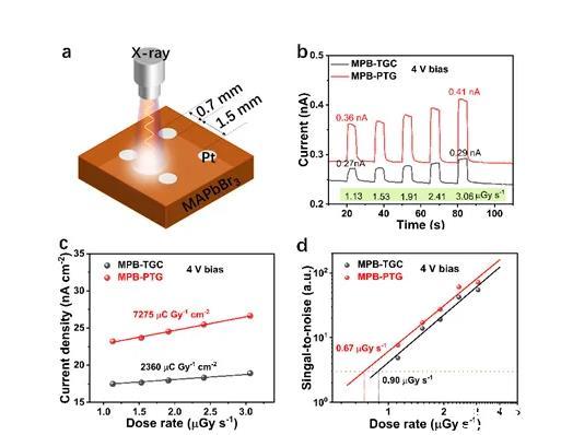 圖4.MAPbBr3單晶探測器的x射線探測器。(a)結(jié)構(gòu)圖;(b)光電流響應;(c)靈敏度;(d)探測極限。