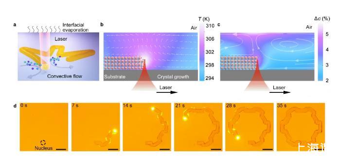研究者利用COMSOL模擬了激光照射下鈣鈦礦晶體周圍的局域過飽和度,并通過實驗驗證了過飽和度產(chǎn)生的原理。其中馬倫格尼對流的引入加速了傳質(zhì)過程,使得鈣鈦礦結(jié)構(gòu)能夠在激光誘導下快速生長,在實驗中,MAPbBr3鈣鈦礦單晶的生長速度可達0.1 mm/s,顯著快于傳統(tǒng)的鈣鈦礦單晶制備方法。激光閾值功率約為150μW,低于現(xiàn)有的激光調(diào)控鈣鈦礦結(jié)晶過程方法。