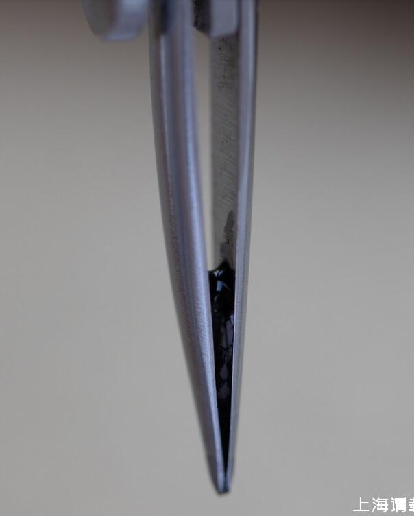 比較簡(jiǎn)單的方法是拿小刀片調(diào)整中縫的開縫大小,和筆尖與筆舌間的距離,使更多的墨水能夠到達(dá)銥粒這邊,靠重力也能克服最后內(nèi)凹的這點(diǎn)距離。這一步驟俗稱“刀尖”。只要不刮花金屬鍍層,基本上整個(gè)過程還是可逆的,就算一次下來效果不滿意也有進(jìn)一步調(diào)整的余地。比如刀得太寬了,還能捏一捏再讓他緊一點(diǎn)。注意這里我們并不是要把中縫一味地開大,而是調(diào)整到合適的寬度,因?yàn)樘珜捘€是會(huì)留在中縫里,太窄又無法順利地從筆舌那邊引過來。