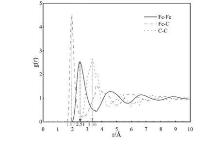 Fe-C二元體系經(jīng)計算得到的徑向分布函數(shù),F(xiàn)e-Fe、Fe-C、C-C原子對的平均鍵長分別為若原子間距離小于相應的鍵長值則表示兩個原子之間互相連接,根據(jù)碳原子連接的鐵原子個數(shù),可將鐵原子區(qū)分為自由態(tài)鐵原子(與碳原子沒有配位關系)、A型鐵(只與1個碳原子形成配位關系)、B型鐵(與2個或更多的碳原子形成配位關系)三種類別,根據(jù)模擬結果數(shù)據(jù)可對鐵原子的配位方式進行分析。