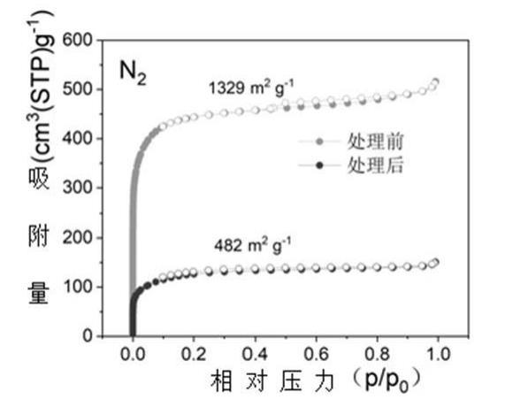 步驟1所用活性碳纖維以及本實施例制備得到的高能量轉(zhuǎn)化效率的碳材料的氮氣吸脫附測試可以看出:制備前活性碳纖維的氮氣吸脫附測出比表面積為1329m2/g,經(jīng)過處理,比表面積降至482m2/g,說明蒽在孔內(nèi)的沉積改變了孔的結(jié)構(gòu),減小了孔容,孔腹尺寸被收縮;