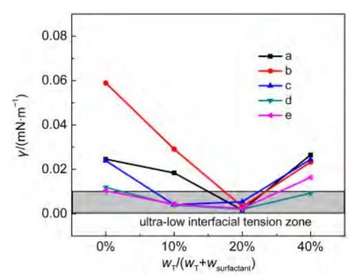從圖3可見,在所考察的五個油水體系中,界面張力先隨保護劑T的比例增加而下降。當保護劑加入量達到10%-20%(摩爾分數(shù))時,即達到最低界面張力。當進一步加入非離子保護劑時,界面張力值反而有所上升。這是因為當較少的非離子保護劑加入時,可有效控制陰陽離子表面活性劑混合體系的沉淀,使混合體系的表面活性劑有效濃度增加。而當保護劑T比例進一步增加時,陰陽離子表面活性劑的實際總量相應減少,使得界面上陰陽離子表面活性劑的實際含量降低。上述實驗結果充分說明了保護劑的具體作用,即保護劑起到的作用是控制了實際體系中鈣鎂離子對陰陽離子表面活性劑的不利影響,從而獲得了合理的油水兩相表面活性劑濃度的平衡,但是其本身并沒有對超低界面張力的獲得有實質性貢獻,是陰陽離子表面活性劑在有效地降低實際油水界面張力。