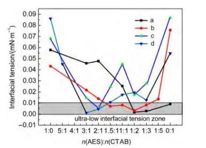 按照陰陽離子表面活性劑:非離子保護劑摩爾比為4:1的比例,在總表面活性劑含量不變的情況下,變化AES/烷基季銨鹽CTAB的混合比例進行研究。實驗結果顯示,陰陽離子表面活性劑復配體系的沉淀得到很好的控制,在七中、石西、陸九、莫北四個實際油水體系中獲得了較大范圍的超低界面張力區(qū)間(圖1)。從而證明了我們采用的三組分策略可有效幫助陰陽離子表面活性劑復配體系實現(xiàn)超低界面張力。