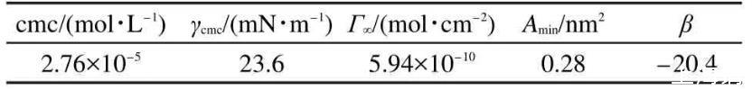 表140°C時烷基季銨鹽CTAB與AES復配體系(摩爾比為1:1)的表面性質和特征參數(shù)β