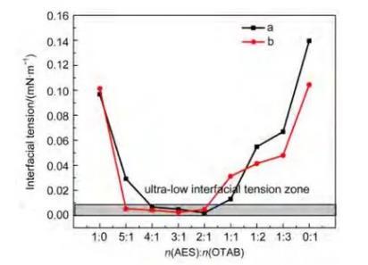 AES/烷基季銨鹽CTAB摩爾比為1:1的混合體系的β參數(shù)計算結果為~20.4,表明AES與烷基季銨鹽CTAB親水基間具有極強的吸引作用。值得注意的是,該體系還具有很高的溫度穩(wěn)定性,在55°C時仍能保持30 mN·m-1以下的表面張力。這說明在較高溫度時該體系的分子排列仍然較為緊密,這和陰陽離子表面活性劑體系中分子因靜電吸引造成的緊密排列是密切相關的??紤]到油水界面張力同樣與界面上的分子排列有關,因此有可能在溫度較高時實現(xiàn)超低界面張力。