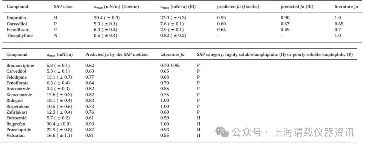 在LCs(先導(dǎo)藥物)的早期研究中,只有少量的化合物可用,如果化合物是兩親性的,SAP方法似乎是獲得fa的一個(gè)有效且快速的工具。只需要少量的LC原液的解決方案(50μl)通過(guò)Delta-8儀器進(jìn)行分析,而沒(méi)有采用進(jìn)一步分析如高效液相色譜法分析,高效液相色譜法盡管其簡(jiǎn)單,能夠預(yù)測(cè)廣泛化合物的藥物的生物利用度(fa),包括高溶性和低溶性的兩親性化合物。而對(duì)于難溶性和高溶性?xún)捎H性化合物,改進(jìn)的SAP(表面活性譜法)預(yù)測(cè)fa值與文獻(xiàn)報(bào)道的藥物分子的fa值相近。但是此方法不適合預(yù)測(cè)非兩親性藥物的fa值。