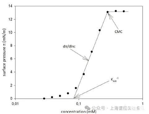 圖1、表面活性分析(SAP):增加一種兩親性物質(zhì)的濃度會(huì)導(dǎo)致更高的表面壓力(π)。Kaw?1是空氣-水分配系數(shù),CMC是臨界膠束濃度,dπ/dlnc斜率和描述物質(zhì)在接口的橫截面積。