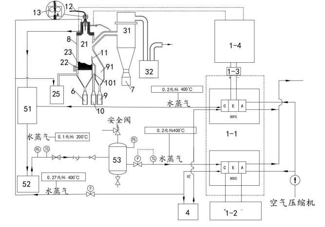 所述供電模塊1中的SOFC燃料電池產(chǎn)生的水蒸氣(0.2Mpa,400℃)進(jìn)入所述汽水混合加熱器51中,所述等離子噴射模塊2、分離過濾模塊3、粗粉收集罐6、細(xì)粉收集罐7與冷卻模塊8換熱后的水(當(dāng)冷卻介質(zhì)為水時(shí))也進(jìn)入所述汽水混合加熱器51中,通過所述汽水混合加熱器51的作用將其轉(zhuǎn)化為水蒸氣并傳輸?shù)剿稣羝l(fā)生器52中,所述蒸汽發(fā)生器52將水蒸氣以(0.2Mpa,400℃)的狀態(tài)傳輸?shù)椒€(wěn)壓罐53中,通過穩(wěn)壓罐53穩(wěn)壓并去除水蒸氣中夾雜的水滴后,高溫的水蒸氣進(jìn)入SOEC電解池中參與電解制氫,并通過儲(chǔ)氫模塊4將制備的氫氣存儲(chǔ)備用。該過程將分離提純過程中供電模塊1中燃料電池燃燒放電產(chǎn)生的高溫水蒸氣與冷卻換熱的熱量加以回收利用,為SOEC電解池提供熱量,避免或減少外部能量的輸入,降低成本。