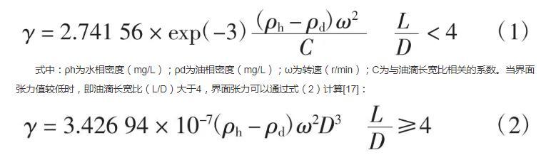 式中:ρh為水相密度(mg/L);ρd為油相密度(mg/L);ω為轉(zhuǎn)速(r/min);C為與油滴長(zhǎng)寬比相關(guān)的系數(shù)。當(dāng)界面張力值較低時(shí),即油滴長(zhǎng)寬比(L/D)大于4,界面張力可以通過式(2)計(jì)算: