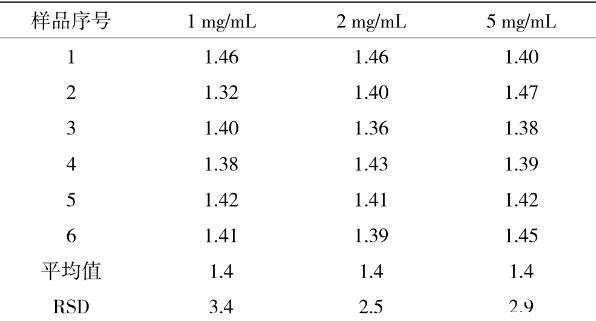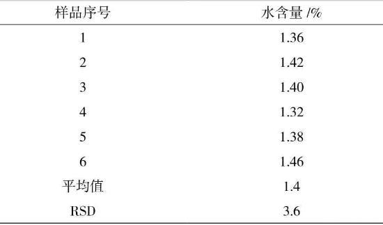 在150℃加熱10 min的測定條件下,采用滴定度為1 mg/mL的費(fèi)休氏試劑,用卡氏干燥爐自動進(jìn)樣法測定樣品中水分含量,樣品測定6次,計(jì)算6次結(jié)果的相對標(biāo)準(zhǔn)偏差(RSD%)數(shù)據(jù)見表5。結(jié)果表明測定結(jié)果具有良好的重復(fù)性。