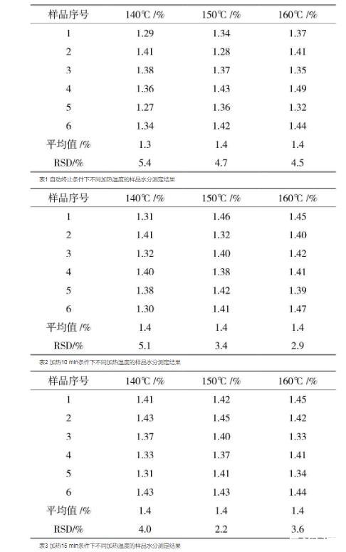 加熱爐樣品轉(zhuǎn)換器的溫度直接影響樣品中水分的蒸發(fā);終止條件也是影響測定結(jié)果的關(guān)鍵因素,加熱時(shí)間太短,樣品中的水分未完全蒸發(fā),導(dǎo)致測定結(jié)果偏低;加熱時(shí)間太長,則延長了測定時(shí)間,環(huán)境因素的影響變大,因此需要選擇合適的終止時(shí)間和加熱溫度[3]。試驗(yàn)分別選擇自動終止、加熱10 min和加熱15 min作為終止條件,在不同的終止條件下分別選擇了140、150、160℃作為加熱溫度,每種條件下連續(xù)進(jìn)樣6次。結(jié)果見表1、表2、表3。結(jié)果表明,當(dāng)選擇自動終止條件時(shí),三個(gè)加熱溫度的樣品結(jié)果的RSD相對較大;當(dāng)選擇10 min和15 min作為終止條件時(shí),加熱溫度為150℃和160℃時(shí),樣品結(jié)果的差異較小。因此選擇加熱溫度150℃,終止條件為10 min比較合適。