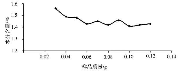 在150℃加熱10 min的測定條件下,樣品稱樣量也會對測定結(jié)果有影響[4]。分別稱取0.03g、0.04g、0.05g、0.06g、0.07g、0.08g、0.09 g、0.10g、0.11g、0.12g的樣品質(zhì)量,考察樣品稱樣量對測定結(jié)果的影響,結(jié)果見圖1。從圖中可以看出,儀器測得樣品水分含量隨著加入樣品質(zhì)量的增大逐漸趨于穩(wěn)定,當(dāng)單次加入的樣品質(zhì)量較小時(shí),測得結(jié)果偏高[5]。稱量樣品質(zhì)量在50~120 mg結(jié)果無明顯差異。