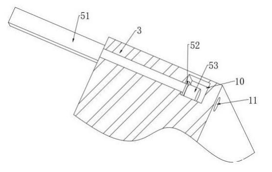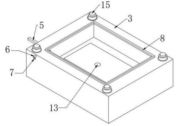 1、上模具;2、注塑口;3、下模具;4、收納槽;5、阻擋部;6、外接管;7、檢測(cè)器;8、修整片;9、放置槽;10、流動(dòng)通道;11、通氣孔;12、熱流部;13、出料液壓桿;14、連接槽;15、電動(dòng)伸縮桿;51、氣缸;52、密封圈;53、阻擋塊;121、熱流板;122、加熱絲;123、阻隔板。