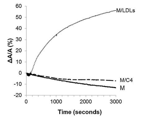 當(dāng)?shù)兔芏戎鞍着c牛精漿混合時(shí) 蛋白質(zhì)重量比為 10:1 (BSP:LDLs) 并注射到單層下方,單層的分子面積隨時(shí)間記錄 幾乎沒(méi)有變化(曲線 M/SP + LDL,圖 5)。 肩膀出現(xiàn)在 大約 400 s 揭示了 BSP 蛋白的弱吸附(這 肩部代表 M/SP 的 5%,上圖曲線)。 然后,該 1000s后分子面積的變化減少并穩(wěn)定。 不會(huì)像 M 和 M/SP 曲線的變化那樣減少, 表明 LDLs 成分的吸附,與 它們?cè)诮缑嫣幍母邤U(kuò)散能力(曲線 M/LDL,圖 4)。 因此,SP 中所含 BSP 蛋白在界面處的吸附 由于低密度脂蛋白而大大降低,并且 BSP/低密度脂蛋白的比率非常高 接近最佳值以完全防止 BSP 蛋白質(zhì)影響單層。 磷脂酰膽堿注射量 根據(jù)低密度脂蛋白的組成估計(jì)為 4.61 毫克 [33]。 因此,注射了 4.61 mg LDLs 的磷脂酰膽堿 26.6mg精漿蛋白質(zhì),即1mg精漿蛋白質(zhì)需要0.17mg磷脂酰膽堿。