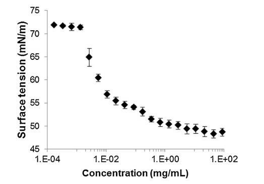圖 2 牛氣水界面表面張力(±標(biāo)準(zhǔn)差) 精漿溶液中所含蛋白質(zhì)濃度的函數(shù) 提取并以對(duì)數(shù)刻度表示 (T = 23.2 ?C ± 0.3 ?C, n = 2, 4 次重復(fù) 每個(gè)樣品)。