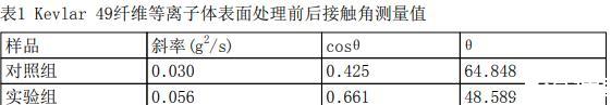 測量結果如下表所示,測量結果為三次平行樣的平均值??梢娊?jīng)等離子體表面處理后,芳綸纖維與水的表面接觸角降低16°,潤濕性提高。