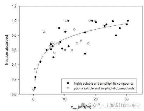 本論文研究人員提出了一種藥物活性分子生物利用度(fa)快速篩選方法-表面活性譜(SAP),作為替代傳統(tǒng)的動(dòng)物研究和細(xì)胞培養(yǎng)篩選。研究人員使用SAP技術(shù),主要是基于Kibron公司的高通量表面張力分析儀----(Delta-8),該儀器只需要50ul原液就能進(jìn)行完整的滲透率分析。并將溶液中化合物的表面活性譜化合物與生物膜相互作用或穿透生物膜的潛力聯(lián)系起來(lái)。用于這種關(guān)聯(lián)的進(jìn)一步參數(shù)包括臨界膠束濃度(CMC)、界面空氣/水分配系數(shù)(KAW?1)和分子在界面的面積要求,即截面面積(AS)等這些表面活性參數(shù)來(lái)獲取藥物的生物利用度(fa值)。此方法的提出對(duì)于先導(dǎo)化合物的早期篩選研究,因?yàn)橄葘?dǎo)化合物只有少量的化合物可用,SAP方法似乎是一個(gè)很有效和快速的工具,可以準(zhǔn)確預(yù)測(cè)兩親性化合物的fa值,為新藥研發(fā)提供了重要的技術(shù)支持,這也說(shuō)明高通量的表面張力分析儀(delta-8)在藥物研發(fā)方面發(fā)揮了重要的作用,尤其是預(yù)測(cè)活性藥物分子的生物利用度(fa)提供了一種新的技術(shù)手段。