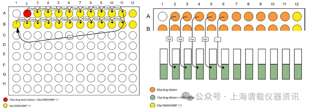 圖2、左邊的圖表示的是采用移液槍將樣品(難溶性的兩親化合物)轉(zhuǎn)移到kirbon公司的96孔板上測(cè)試其表面張力。右圖表示的是采用了改進(jìn)的制備難溶性的兩親性化合物的表面張力的方法。