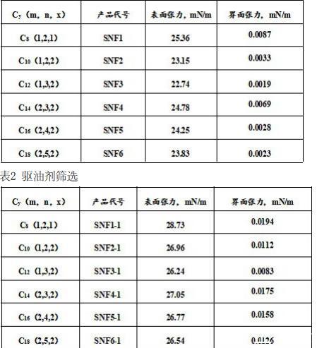 由表1可知,當m、n、x的摩爾比為1:3:2時,制得的驅(qū)、滲一體化驅(qū)油劑的親油碳鏈主鏈長度為12,此時該驅(qū)、滲一體化驅(qū)油劑的表面張力和界面張力均達到最低值。