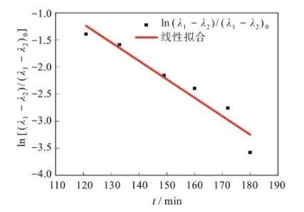 通過(guò)實(shí)驗(yàn)可以得到L和B的時(shí)間演化,界面張力可以通過(guò)ln(λ1-λ2)/(λ1-λ2)0~t的斜率求得。通過(guò)軟件擬合出的形狀因子隨時(shí)間演化的圖形如圖5所示。利用式(1)~式(3)計(jì)算得到,PS/POE體系在230℃時(shí)系統(tǒng)的界面張力為0.397 mN/m。