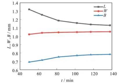 圖7為數(shù)值仿真過程中液滴三軸隨時(shí)間演化規(guī)律。綜合對(duì)比圖4和圖7,數(shù)值仿真軟件與實(shí)驗(yàn)過程中球形液滴的三軸長(zhǎng)度變化趨勢(shì)基本一致??梢钥闯?,在體積保持不變的假設(shè)下,球形液滴的第二半軸和第三半軸變形頻帶是不一致的。該結(jié)果表明一些黏彈性液滴的變形和收縮不嚴(yán)格符合仿射變形假設(shè)(即第三半軸W始終等于第二半軸B),這與文獻(xiàn)結(jié)果類似。數(shù)值仿真結(jié)果中液滴最終形態(tài)不是一個(gè)三軸長(zhǎng)度相等的球形,主要原因是仿真過程中使用的非牛頓流體的本構(gòu)模型只對(duì)黏性項(xiàng)進(jìn)行了修改,而忽視了彈性應(yīng)力的影響,因此與理論計(jì)算結(jié)果有一定誤差。