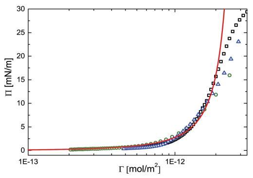圖 2 表面壓力(P)與吸附的 PNIPAM 顆粒量 (G) 在空氣-水界面上。 開放符號表示實驗 對應(yīng)于三組不同實驗的數(shù)據(jù)點 即:(,)具有高初始粒子負(fù)載的 NIMA 槽,(B)NIMA 低初始粒子負(fù)載的槽和 (D) Kibron m 槽 高初始粒子負(fù)載。 紅色實線表示預(yù)測 使用 Groot 和 Stoyanov 模型制作。