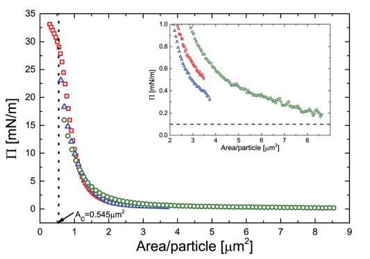 壓力面積等溫線是通過壓縮獲得 在朗繆爾槽上涂抹單層膜,用于 3 組不同的 實驗。 這些等溫線中的區(qū)域坐標(biāo)被縮放 由吸附在界面上的顆粒數(shù)量決定。 一切 曲線折疊成單個圖,如圖 1 所示。 增加壓縮,壓力最初變化很小,但 每個顆粒低于 2 mm2,壓力會急劇增加。 曲線的斜率首先增加,但達到 最大在 ~27 mN m- 1 處有一個拐點 其次是稍弱的斜率。 面積值 對應(yīng)于該拐點的粒子 (Ac) 結(jié)果為 為 0.545 mm2,如圖 1 中的虛線所示。假設(shè) 顆粒緊密堆積,這對應(yīng)于~835 nm 的顆粒間距離,遠(yuǎn)大于 在本體中測量的顆粒的流體動力學(xué)直徑 溶液 (590 nm) 表明顆粒確實是 大幅度變形。 如圖 1 的插圖所示,有限 0.5 mN m- 1 級的表面壓力(即遠(yuǎn)高于我們的 檢測限為 0.1 mN m- 1 ) 事實上已經(jīng)可以測量了 每個粒子的面積約為 4 mm2 . 插圖還表明 P 的絕對值可再現(xiàn)在 0.3 mN m- 1 以內(nèi) 在兩個不同朗繆爾的不同實驗之間 槽。