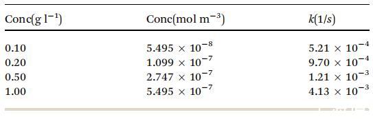表 2 不同濃度的速率常數(shù) k(1/s) 值 由圖 6 中的實驗曲線計算
