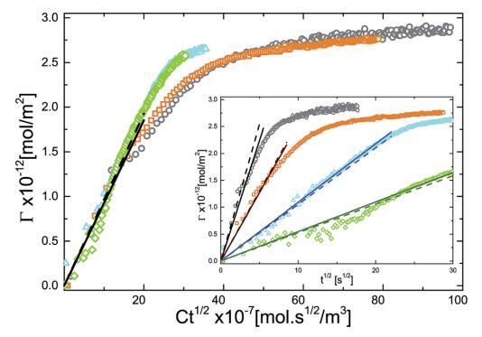 圖 5 吸附量 (G) 作為乘積 Ct1/2 的函數(shù)。 這 插圖顯示了不同體積的 G 與 t1/2 的單獨曲線 微凝膠顆粒濃度:(>)0.10 g l-1 , (D)0.20 克 l-1 , (,) 0.50 克 l-1 , (B)1.00 克 l-1 . 實線是直線擬合和虛線 用使用 D ? DDLS 計算的斜率繪制。