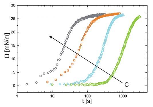 已經(jīng)建立了一個狀態(tài)方程來關(guān)聯(lián) 表面壓力和吸附量,我們現(xiàn)在繼續(xù) 研究顆粒的吸附動力學(xué)。 為此我們 監(jiān)測新鮮的界面張力的演變 在 PNIPAM 顆粒懸浮液中制備氣泡作為 時間的函數(shù)。 我們轉(zhuǎn)換界面張力值 轉(zhuǎn)化為表面壓力。 結(jié)果如圖 4 所示。 表面壓力值最初迅速增加,然后 放松到最終的平衡值。 動態(tài)可以一目了然 分為兩個獨立的時間尺度:初始快速 由表面壓力增加表示的動力學(xué) 值,以及隨著系統(tǒng)向最終放松而緩慢的部分 平衡狀態(tài)。 快速動力學(xué)之間的這種區(qū)別 短時間和長時間慢得多的動力學(xué)是許多表面活性物質(zhì)的吸附行為的特征 材料.32,33