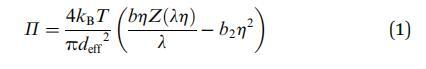 吸附在流體-流體界面上的粒子與 并產(chǎn)生表面壓力 (P),即 3D 系統(tǒng)中壓力的 2D 模擬。 通過擴展這個 進一步類比,也可以將這個表面壓力聯(lián)系起來 通過狀態(tài)方程到其他狀態(tài)參數(shù),如數(shù)密度和溫度。 用于吸附膠體顆粒 在流體-流體界面上,最簡單的近似可能是 2D硬盤。 狀態(tài)方程 (EOS) 為一個 組件系統(tǒng)根據(jù)密度相關(guān)性給出 壓縮系數(shù) Z。文獻中充滿了 提供表達的多種方法 EOS 2D 硬盤液。 Mulero 等人 27,28 提供了一個簡潔的 回顧和比較所有這些狀態(tài)方程。