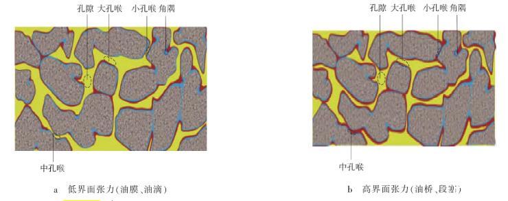 凝析氣藏開發(fā)過程中伴隨著油氣界面張力σog的變化,當(dāng)?shù)貙訅毫Ω哂诼饵c(diǎn)壓力時(shí),處于混相狀態(tài),油氣界面張力接近0 mN/m;當(dāng)?shù)貙訅毫β缘陀诼饵c(diǎn)壓力時(shí),出現(xiàn)反凝析現(xiàn)象,少量凝析油析出,此時(shí)油氣界面張力較小,析出的凝析油以油膜狀態(tài)附著在束縛水之上,即以油膜鋪展方式分布于儲層中。在曲率較大的孔隙角隅處,由于毛細(xì)凝聚作用,以油滴方式分布,凝析油易流動,實(shí)驗(yàn)測量的凝析油臨界流動飽和度一般小于10%[14](見圖1a);隨著凝析氣藏的開發(fā),當(dāng)?shù)貙訅毫h(yuǎn)低于露點(diǎn)壓力時(shí),大量凝析油析出,油氣界面張力迅速增加,到最大反凝析壓力時(shí)的界面張力可比露點(diǎn)壓力時(shí)的高2個(gè)數(shù)量級[4]。析出的凝析油大部分以段塞的形式分布于孔隙喉道與角隅,相對于凝析油膜更難以流動,凝析油臨界流動飽和度增大(見圖1b)。