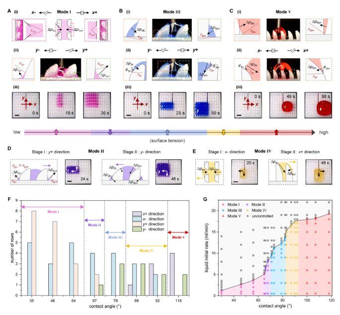 注入結(jié)構(gòu)化表面的液體首先填充相鄰四個(gè)單元間的空隙,并在單元的特定曲率結(jié)構(gòu)處形成局部曲率不等的液體彎月面,這導(dǎo)致液體表面不同位置的拉普拉斯壓差不同,進(jìn)而驅(qū)動液體定向運(yùn)輸。隨表面張力從低到高(22-72 mN/m),液體呈現(xiàn)出五種不同的運(yùn)輸模式(I至Ⅴ)。研究人員利用水-乙醇溶液對這五種模式下液體沿x軸和y軸方向上的運(yùn)輸行為進(jìn)行力學(xué)分析(圖2)。表面張力較低的液體對界面的潤濕性較高,因此主要在單元底部曲率結(jié)構(gòu)作用下,沿拉普拉斯壓差較低的方向運(yùn)輸;而表面張力較高的液體會在結(jié)構(gòu)化表面上積累,其運(yùn)輸方向由單元頂部曲率調(diào)控。