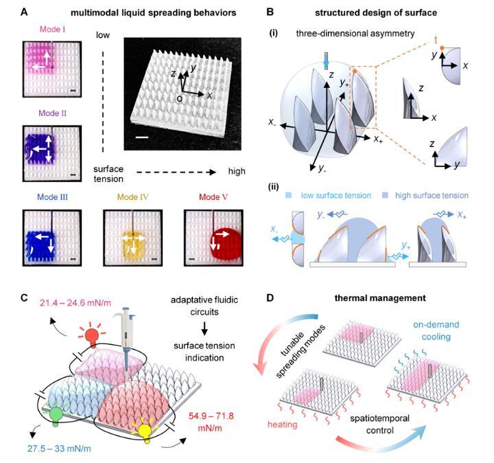 為實(shí)現(xiàn)多向調(diào)控液體,香港理工大學(xué)王立秋教授團(tuán)隊(duì)提出了由陣列式三維不對稱尖牙結(jié)構(gòu)單元組成的結(jié)構(gòu)化表面,為不同表面張力液體定制運(yùn)輸方向,并呈現(xiàn)出五種新穎的運(yùn)輸模式(圖1)。這種智能調(diào)控液體的能力源于所設(shè)計(jì)表面單元自下而上分布的多曲率特征,在三維空間上交替地主導(dǎo)液體表面的局部拉普拉斯壓差,從而原位控制不同潤濕性液體的多樣定向運(yùn)輸模式。該表面根據(jù)液體特性實(shí)施多模式控制的能力使其具備傳統(tǒng)結(jié)構(gòu)化表面難以實(shí)現(xiàn)的創(chuàng)新功能,如構(gòu)建自適應(yīng)液體電路、便攜式表面張力指示器、智能調(diào)控液體及按需熱管理。該研究以“In Situ Multi-Directional Liquid Manipulation Enabled by 3D Asymmetric Fang-Structured Surface”為題發(fā)表于《Advanced Materials》,團(tuán)隊(duì)博士生孫思琦為論文第一作者,王立秋講席教授為通訊作者,張藝媛研究助理教授為共同通訊作者。
