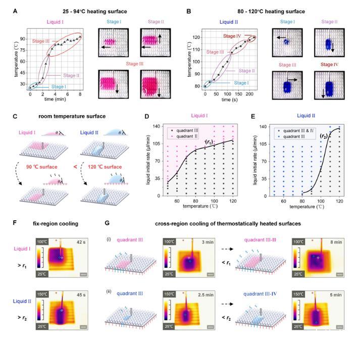 在熱交換應(yīng)用中,溫度導(dǎo)致的液體性質(zhì)變化是一個(gè)廣泛存在的現(xiàn)象,給傳統(tǒng)的液體操縱表面在高溫環(huán)境下的應(yīng)用帶來了挑戰(zhàn)。本研究提出的結(jié)構(gòu)化表面能在高溫環(huán)境下有效維持對液體的定向運(yùn)輸。并在高溫導(dǎo)致的液體表面張力變化下,完成了在持續(xù)變溫表面上對液體運(yùn)輸方向的智能調(diào)控,和在恒溫加熱表面上時(shí)空可控的靶向冷卻(圖4)。這種基于溫度調(diào)控液體性質(zhì)的智能液體運(yùn)輸能力,為按需熱管理提供了新的解決方案。