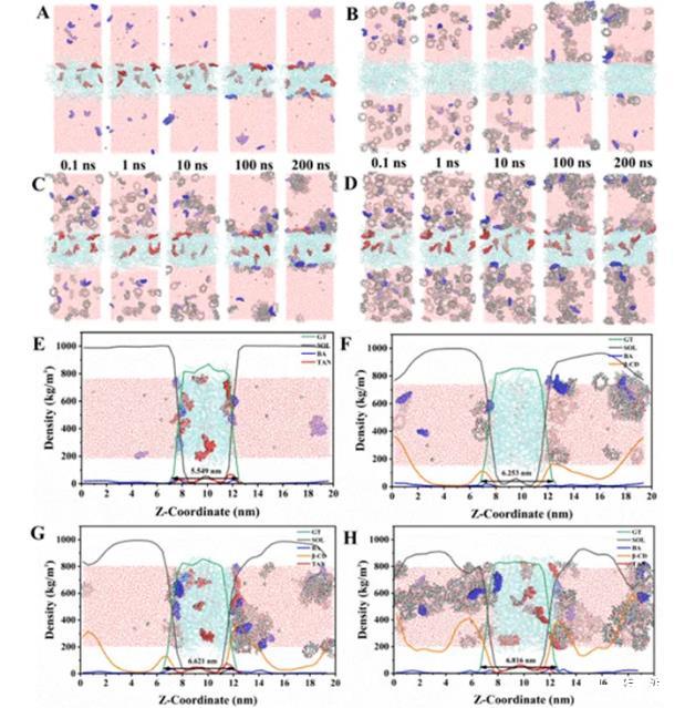 界面層厚度受分子種類、結構及密度影響顯著。實驗表明,實驗組尤其是實驗2中油相增厚,可能是由于TAN在油水界面與膽鹽和β-CD發(fā)生相互作用。該現象說明β-CD與TAN之間的相互作用不僅促進了TAN向界面遷移,還揭示了BS或β-CD對TAN的吸附能力。實驗組界面β-CD密度提升,說明β-CD與TAN相互吸引。動力學模擬結果表明β-CD先與TAN結合于界面,誘導膽鹽圍繞此復合物聚集,系統(tǒng)能量漸趨穩(wěn)定。最終,TAN主要錨定于由膽鹽與環(huán)糊精構筑的界面團聚體上,增強環(huán)糊精對膽鹽的親和力,導致環(huán)糊精與膽鹽組裝形成更大的聚集體,從而增加界面厚度。