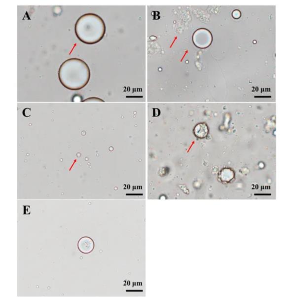 通過顯微鏡觀察發(fā)現未添加橘皮素(TAN)和β-環(huán)糊精(β-CD)的乳液液滴粒徑較大,且界面處未產生液晶。脂肪酶存在下,脂質消化過程中產生層狀液晶。當該液晶與脂肪酶相互作用時會經歷擠壓機制,導致液晶外殼破裂,液滴中未水解的油被排出。分別含有TAN、β-CD和TAN/β-CD的乳液均處于第一產物層狀液晶相的形成階段,在相同的消化時間內消化行為相似。結果表明,TAN和β-CD都具有阻礙液晶相形成的能力,且TAN比β-CD的抑制能力更強。且TAN和β-CD的共存導致液滴表面液晶相的形成顯著減少。