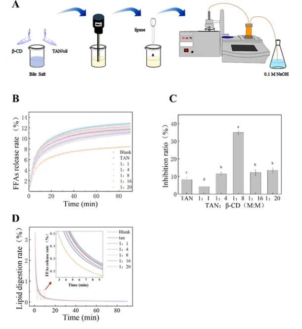 β-CD與TAN協(xié)同作用顯著減少NaOH消耗,抑制脂質消化。脂質消化程度受到抑制,抑制程度與β-CD添加量無關。當TAN與β-CD的摩爾比為1:8時,抑制脂質消化的效果最佳,抑制率為34.92%。這可能是因為兩者在界面上自組裝,增強了界面活性。β-CD與疏水物質形成的復合物可以通過氫鍵在油水界面上組裝形成致密網絡,顯著增強界面穩(wěn)定性,限制脂肪酶在界面區(qū)域的吸附,從而抑制脂質消化。在消化的后期階段,物質在液滴間的置換達到平衡,從而在界面處產生恒定和動態(tài)的可吸附區(qū)域。此時,消化速率變化不大,游離脂肪酸的釋放和解吸速率保持相對恒定。