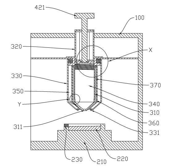 副筒320和滴液筒310之間限定出滴液腔340,滴液筒310上開設(shè)有出液口311,滴液腔340與出液口311連通。涂片臺200安裝于外殼100上,出液口311和涂片臺200在第一方向上依次設(shè)置,且當(dāng)出液口311滴出一個(gè)待檢測液的液滴時(shí),液滴沿第一方向上靠近涂片臺200的一端能夠與涂片臺200接觸。外筒330上具有第一空腔350,外筒330上開設(shè)有進(jìn)氣口331,進(jìn)氣口331設(shè)置在出液口311外側(cè),進(jìn)氣口331與第一空腔350連通。滴液筒310繞第一方向轉(zhuǎn)動(dòng)能夠分別促使副筒320和外筒330沿第一方向移動(dòng),且在進(jìn)行滴液操作時(shí),副筒320沿第一方向移動(dòng)能夠使滴液腔340體積變小,外筒330沿第一方向移動(dòng)能夠使第一空腔350體積變大。