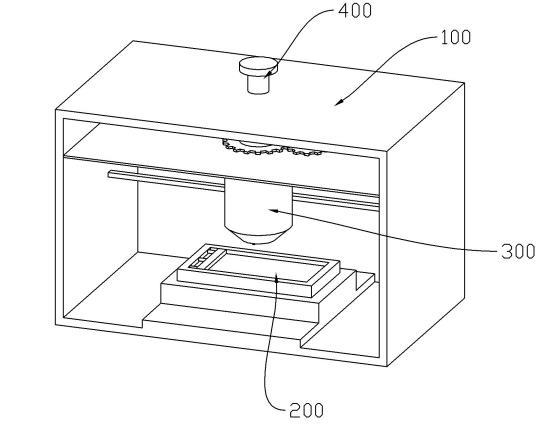 一種醫(yī)學(xué)檢測用涂片裝置,包括外殼100、涂片臺200和滴液機(jī)構(gòu)300。滴液機(jī)構(gòu)300包括滴液筒310、副筒320和外筒330。滴液筒310能夠繞第一方向轉(zhuǎn)動(dòng)地安裝于外殼100上,第一方向?yàn)樨Q直方向。滴液筒310內(nèi)裝有待檢測液。副筒320與滴液筒310同軸設(shè)置并套接于滴液筒310內(nèi),外筒330與滴液筒310同軸設(shè)置并套接于滴液筒310外,將沿第二方向靠近滴液筒310中心軸線的一側(cè)稱為內(nèi),沿第二方向遠(yuǎn)離滴液筒310中心軸線的一側(cè)稱為外,第二方向與第一方向垂直,第二方向?yàn)樗椒较颉?