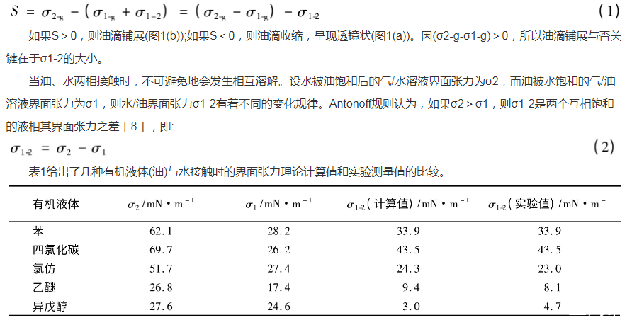 圖1中液體表面存在界面張力[5-6],其值的大小是物質(zhì)分子間相互作用的一種反映,與物質(zhì)的本性有關(guān)。在常見純液體中,水的界面張力最高,25℃時(shí)為72.0mN·m-1,極性有機(jī)物液體的界面張力大多低于50mN·m-1,非極性有機(jī)液體的界面張力一般更?。?]。由此可知,氣/水界面張力大于氣/油界面張力,即σ2-g>σ1-g。根據(jù)鋪展系數(shù)(S)的定義:
