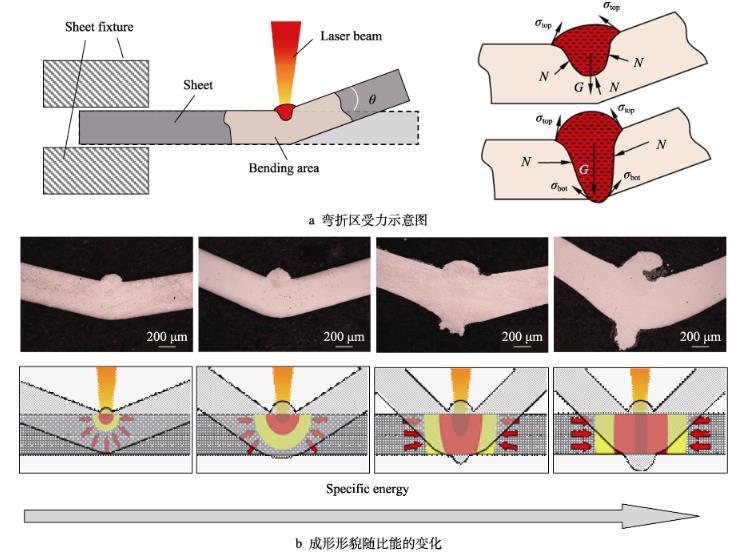 通過觀察激光熱應(yīng)力成形過程中彎折處的形貌發(fā)現(xiàn),激光熱輸入、彎曲角度和成形機(jī)制會(huì)影響彎折區(qū)材料表面的擠壓、熔化、流動(dòng)和凝固過程,以及材料內(nèi)部的溫度梯度和界面表面張力,這些影響導(dǎo)致彎折區(qū)域的輪廓形貌、粗糙度、顯微組織、硬度分布發(fā)生變化。在激光熱應(yīng)力成形過程中,熔池的受力情況如圖1a所示。一方面,當(dāng)比能較小且熔凝區(qū)僅存在金屬板上表面時(shí),薄板彎折處的增厚主要受到左右兩側(cè)和下側(cè)冷端材料的約束作用,通過作用于上側(cè)材料,且上表面局部熔化的材料在頂端表面張力的作用下,形成了頂部凸起的形貌。同時(shí),由于激光瞬態(tài)作用時(shí)間較短,熔融材料在激光掃描結(jié)束后快速凝固,并在掃描次數(shù)逐漸增加的過程中形成連續(xù)隆起的形貌,在彎折處形貌演變過程中粗糙度逐漸增大。在高比能下,薄板彎折處材料的熔化凝固和塑性變形受到左右兩側(cè)材料的橫向約束,該區(qū)域在左右兩側(cè)材料的擠壓下增厚。