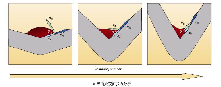另一方面,材料內(nèi)部的溫度梯度和界面表面張力亦會(huì)導(dǎo)致彎折區(qū)的形貌發(fā)生改變。通過觀測(cè)不同比能和掃描次數(shù)下薄板彎折區(qū)的成形狀態(tài)發(fā)現(xiàn),在高比能、多次掃描下,彎折區(qū)界面的形貌由凸向凹演變,潤(rùn)濕角顯著降低,如圖1c所示??梢?,比能和掃描次數(shù)是造成形貌發(fā)生變化的重要因素,最終通過影響熔池的表面張力和溫度梯度,進(jìn)而影響彎折區(qū)的宏觀形貌。
