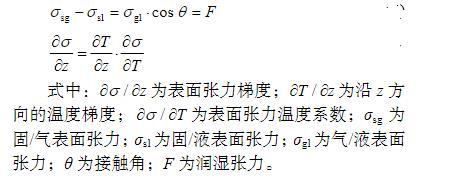 通過對(duì)成形過程彎折區(qū)域材料的溫度梯度和界面表面張力進(jìn)行分析可知,激光熱應(yīng)力成形界面處的表面張力與潤(rùn)濕角θ的關(guān)系可用楊氏方程表示,見式(1)。在成形結(jié)束后,界面表面張力的矢量和為零,同時(shí)熔凝層表面張力與溫度梯度存在如式(2)所示的關(guān)系。